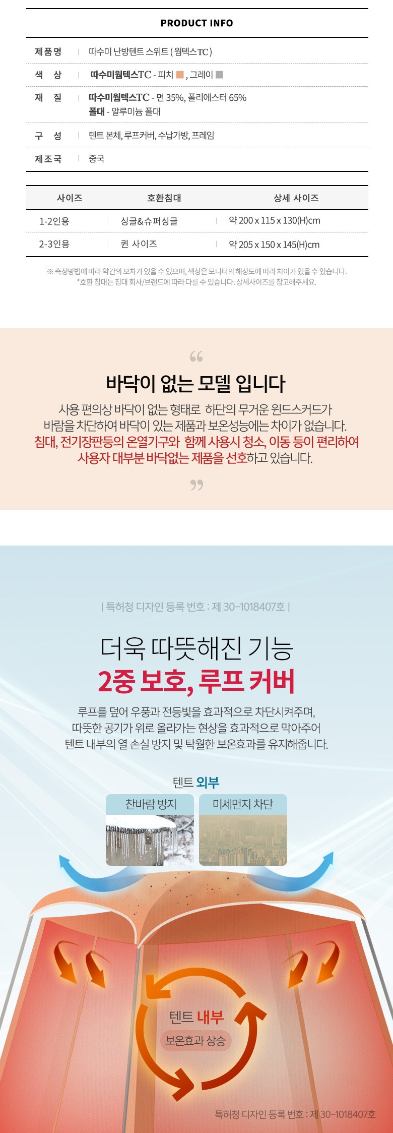 너무 따뜻하고 좋아요.보기에도 너무 이쁘구요.세번째 텐트인데 앞에 두 상품들(타사제품)은 한두가지 불편함때문에 꾀 신경쓰였는데 이 제품은 완전 짱입니다.