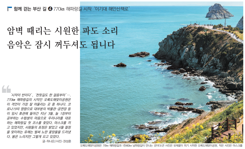 오른편으로는 파 란 바다 위로 암벽에 부딪힌 파도가 하얗게 부서 지며 "촤 촤 촤" 기분 좋은 소리를 내고 왼편으 로는 이름 모를 나무와 꽃이 신록을 뽐낸다. "코로나 때문에 바깥에도 못 나가고 여간 답답 해야 말이죠. 이곳은 바닷바람이 세니 바이러스 도 날려버릴 것 같아요." 선글라스와 마스크가 곱게 잘 어울리는 70대 어르신들이 밝은 목소리 로 말했다.